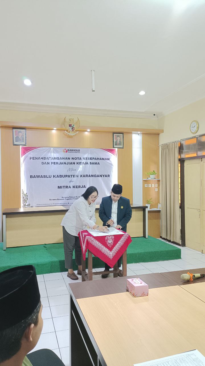 Karanganyar (08/12). Bawaslu Kabupaten Karanganyar menjalin kerja sama dengan DPD LDII Kabupaten Karanganyar melalui penandatanganan Nota Kesepakatan (MoU) dan Perjanjian Kerja Sama yang digelar di Aula Kantor Bawaslu Karanganyar pada Sabtu (08/11). Kerja sama ini bertujuan memperkuat sinergi pengawasan pemilu agar berjalan jujur, adil, dan berintegritas.